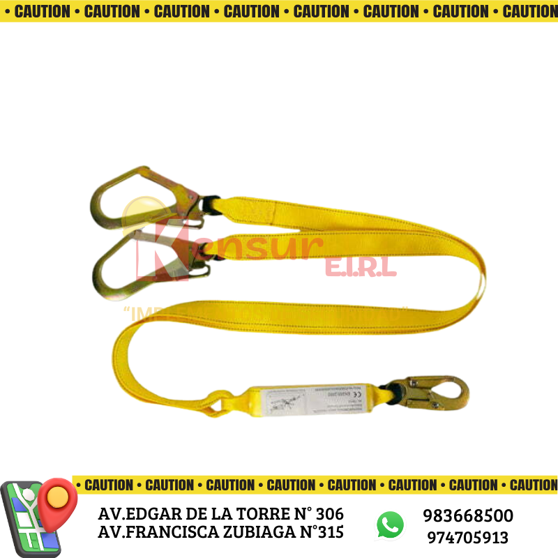 Nuestralínea de vida doble cuenta con tres ganchos metálicos: uno de 3/4 para ser colocado en el anillo dorsal del arnés y dos en 2 l/4 para conectarse, amortiguador de impacto para reducir la fuerza de ca1da y correas ajustables para un mayor confort