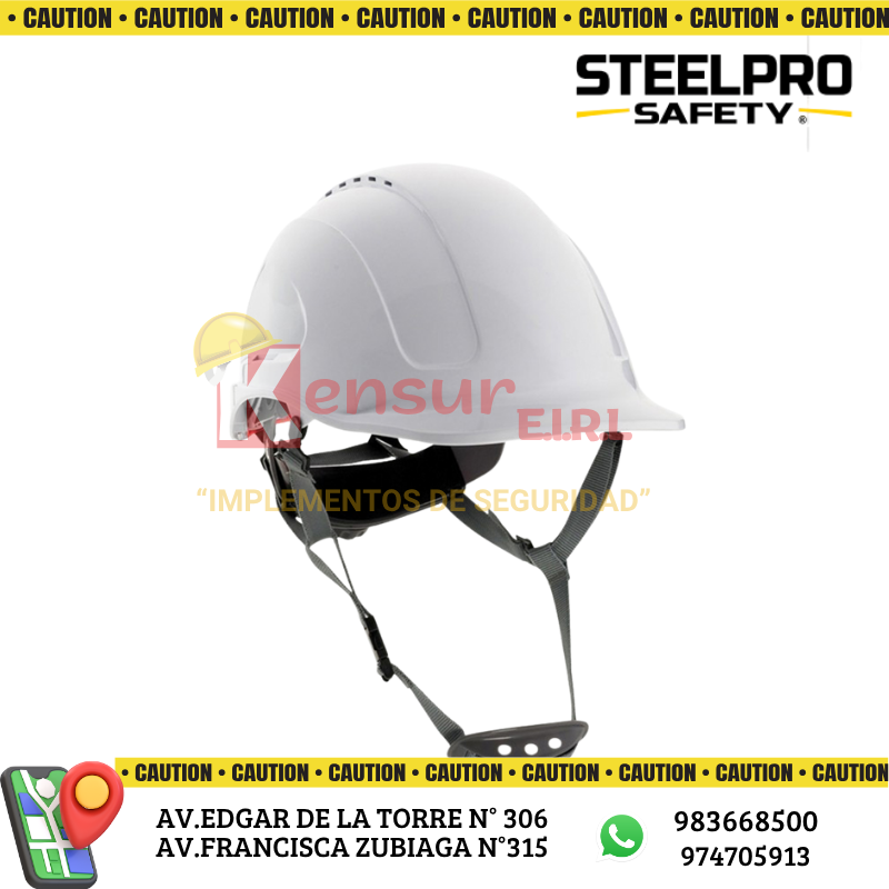 Casco Mountain Steelpro, especialmente diseñado para protección de la cabeza ante riesgo de impacto vertical y lateral. Fabricado en material termoplástico ABS de alta resistencia para brindar adecuada protección en labores de alturas, espacios confinados y/o trabajos eléctricos.